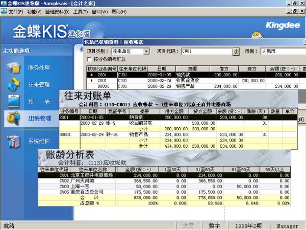 ● 高性价比 金蝶KIS迷你版充分为用户着想,是采用最成熟的技术,本着“实用、够用、好用”的原则开发的新产品,价格便宜。金蝶KIS迷你版对运行环境要求不高,对用户硬件配置要求低。用户无须额外升级现有的电脑软硬件,也无须再多花钱购买配套的数据库软件等,即可快速投入使用,极大节省用户投资。 ● 快速应用,快速见效 金蝶KIS迷你版的界面设计标准,美观大方。业务流程设计清晰,账簿报表一目了然。软件的模块化程度高,在一个模块中聚合了多种功能,您只需记忆少量功能模块的使用方法就能完成全部工作。同时,随同产品还提供了金蝶KIS多媒体教学光盘,便于自学。使用户可在最短时间内上手。附图是金蝶KIS7.4迷你版的出纳管理的一个界面,请大家先睹为快。